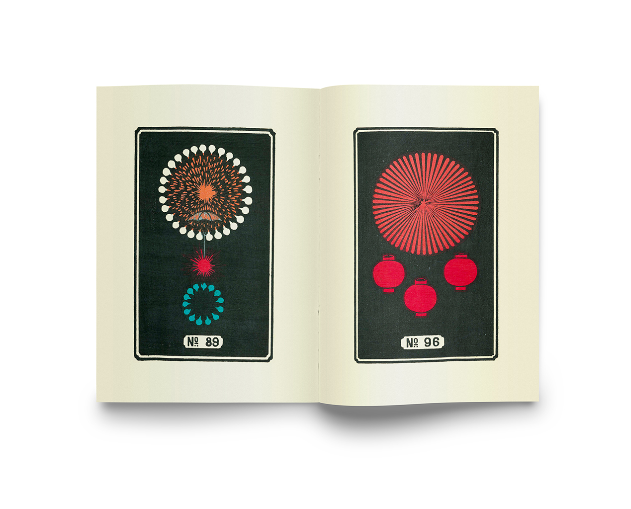 Ces images sont tirées d’un catalogue publicitaire pour les feux d’artifice Hirayama, publié vers 1890 par C. T. Brock & Co, la plus ancienne manufacture pyrotechnique britannique, fondée en 1698. Les feux d’artifice, inventés en Chine autour du IIe siècle av. n. è. et apparus au Japon vers 1600 sous le nom de hanabi (“fleurs de feu”), se sont développés et épanouis au XIXe siècle à Edo (devenue Tōkyō en 1868). Hirayama Jinta ajoute aux feux d’artifice habituels – en cascades orangées – toute une gamme de motifs originaux et de couleurs brillantes. Ces illustrations simplifiées leur ajoutent une étonnante dimension graphique.