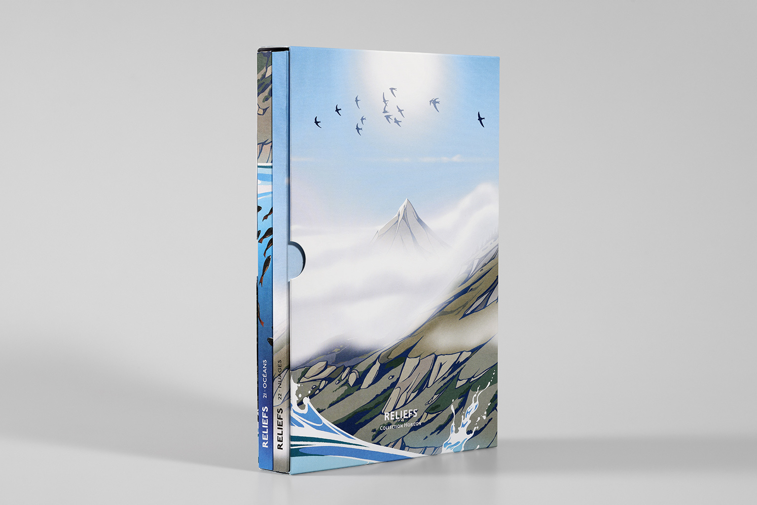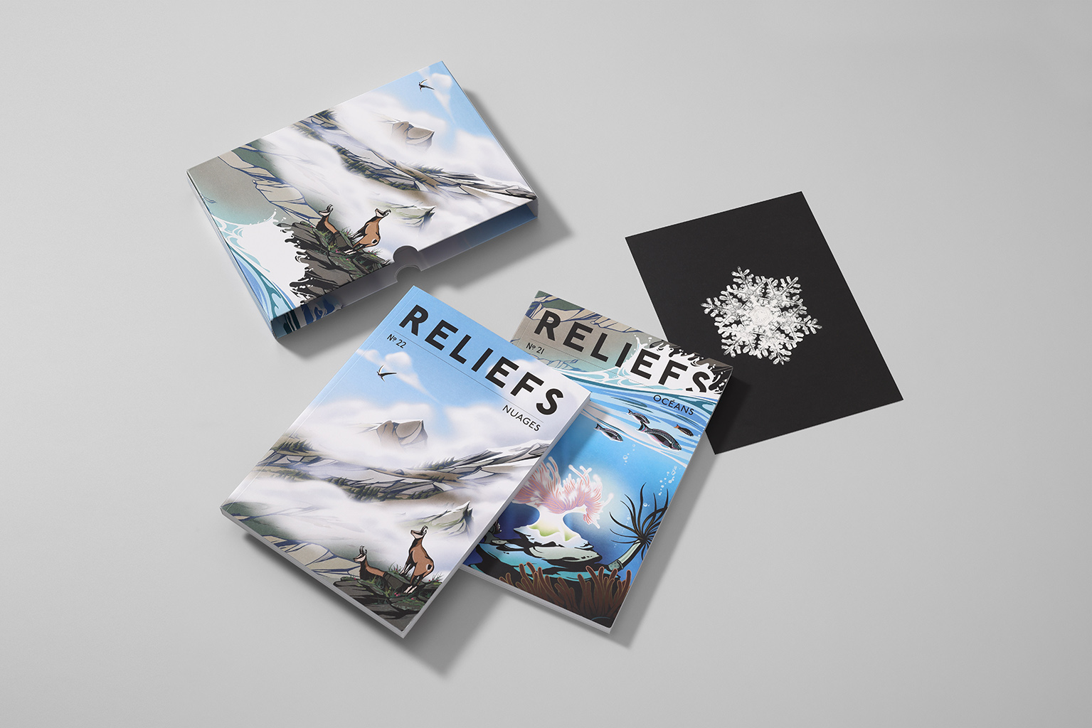 Un coffret prestige en édition limitée avec les deux numéros de la collection « Horizon » de 2025 : Reliefs #21 OCÉANS et Reliefs #22 NUAGES. Un tirage 18 × 24 cm sur un papier d’art 300 g : « Stellar Snowflake, n° 586 », de Wilson Alwyn Bentley, tiré de la série Flocons de neige (1890-1930). Avec une approche transversale pour les dossiers OCÉANS et NUAGES (hydrologie, géographie, climatologie, éthologie, littérature) par Sandrine Bony-Lena, Fabienne Delfour, Françoise Gaill, Marine de Guglielmo Weber, Catherine Jeandel, Gilles Ramstein, Anouchka Vasak…