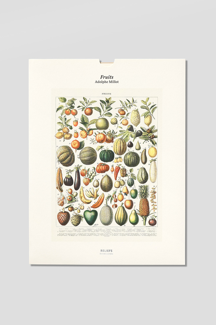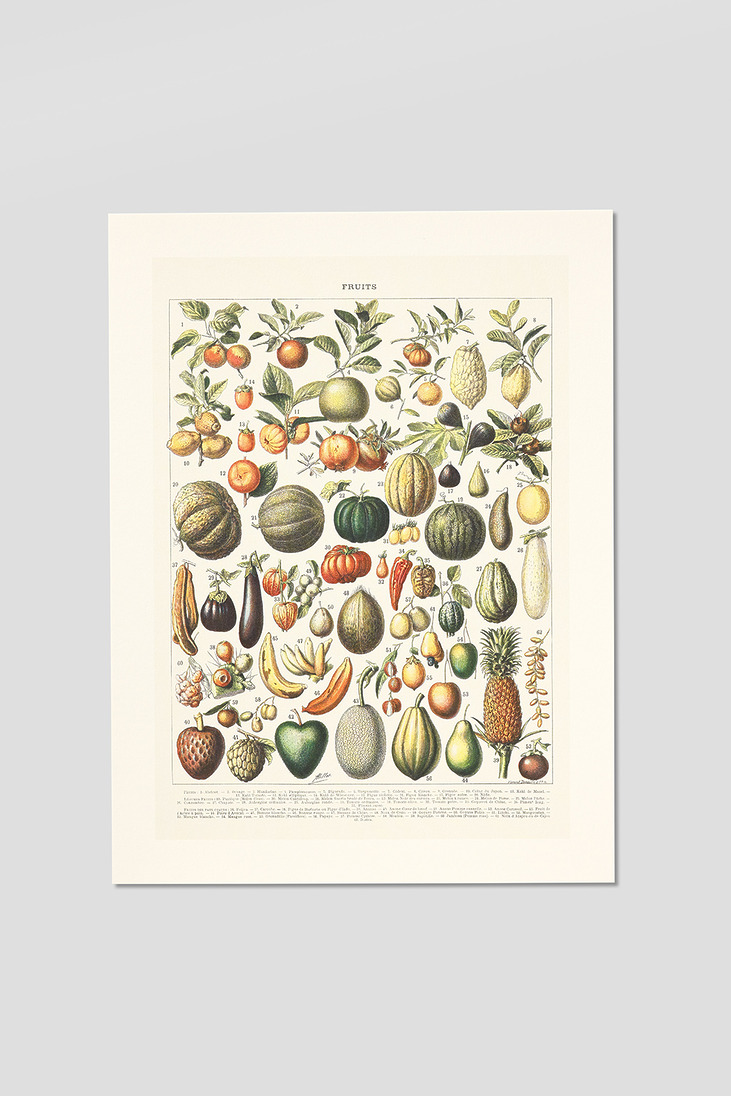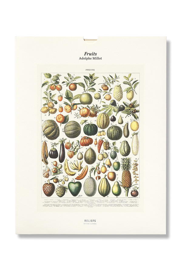 Cette planche est l’une des 89 planches doubles qui illustrent les sept volumes du Nouveau Larousse illustré – publié sous la direction de Claude Augé entre 1898 et 1904 –, en compagnie de 49 000 gravures en noir et blanc et 504 cartes en couleurs. Certains des fruits et légumes-fruits qui nous font saliver nous semblent aujourd’hui aussi étranges ou exotiques qu’ils l’étaient lors de leur publication, même si la consommation de fruits frais en France, en réalité l’apanage d’une minorité privilégiée, est passée de 13 kg par an et par habitant à 40 kg en 1900. Pourtant toujours cultivés ou importés à grands frais, kaki elliptique, melon sucrin de Tours, melon noir des Carmes, coqueret de Chine, anone cœur de bœuf, anone Corossol, pomme Cythère, mombin, mangoustan ou jambosa sont peu connus, et rarement présents sur les étals de fruits et légumes ou dans nos compotiers, monopolisés par un nombre réduit de variétés agro-industrielles.