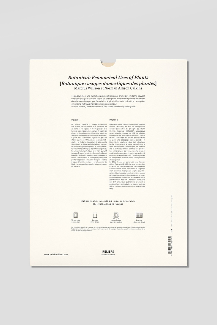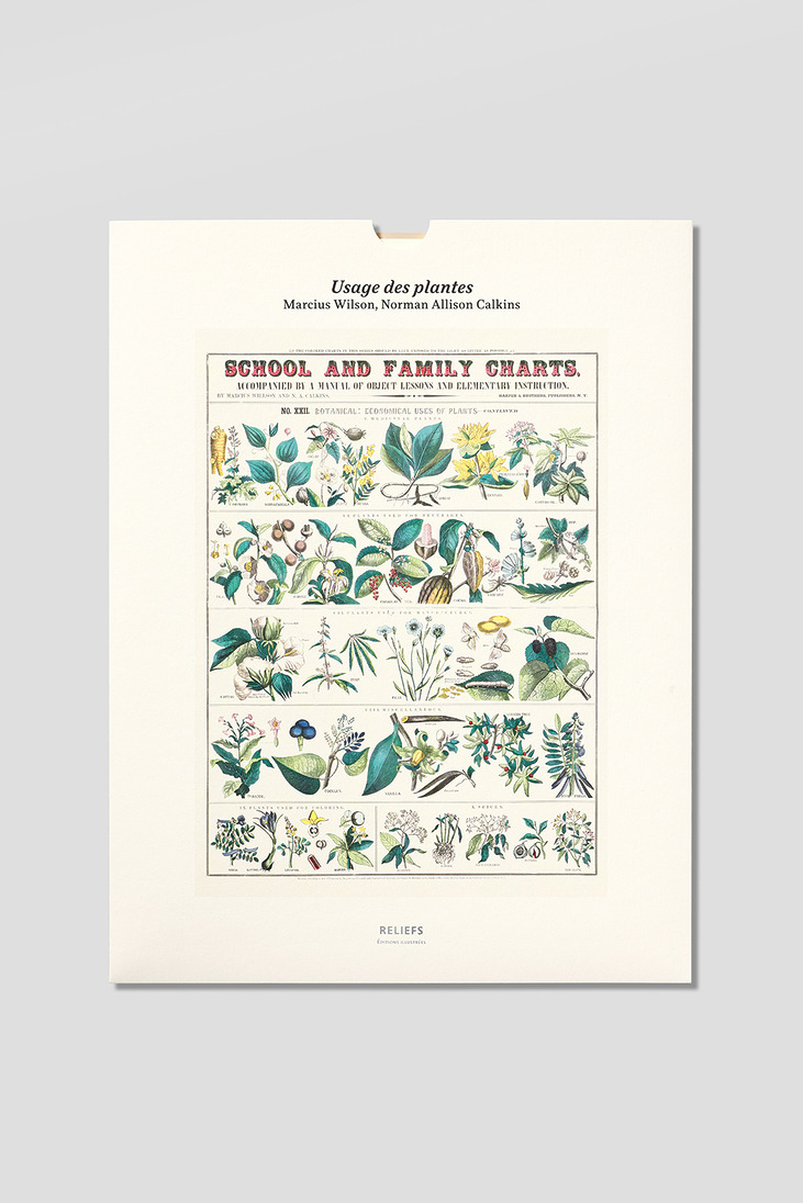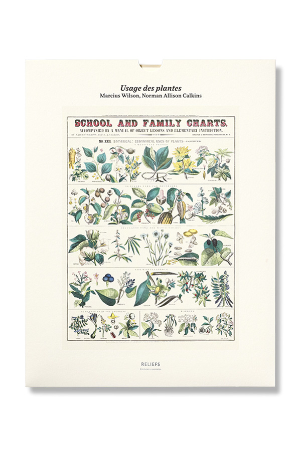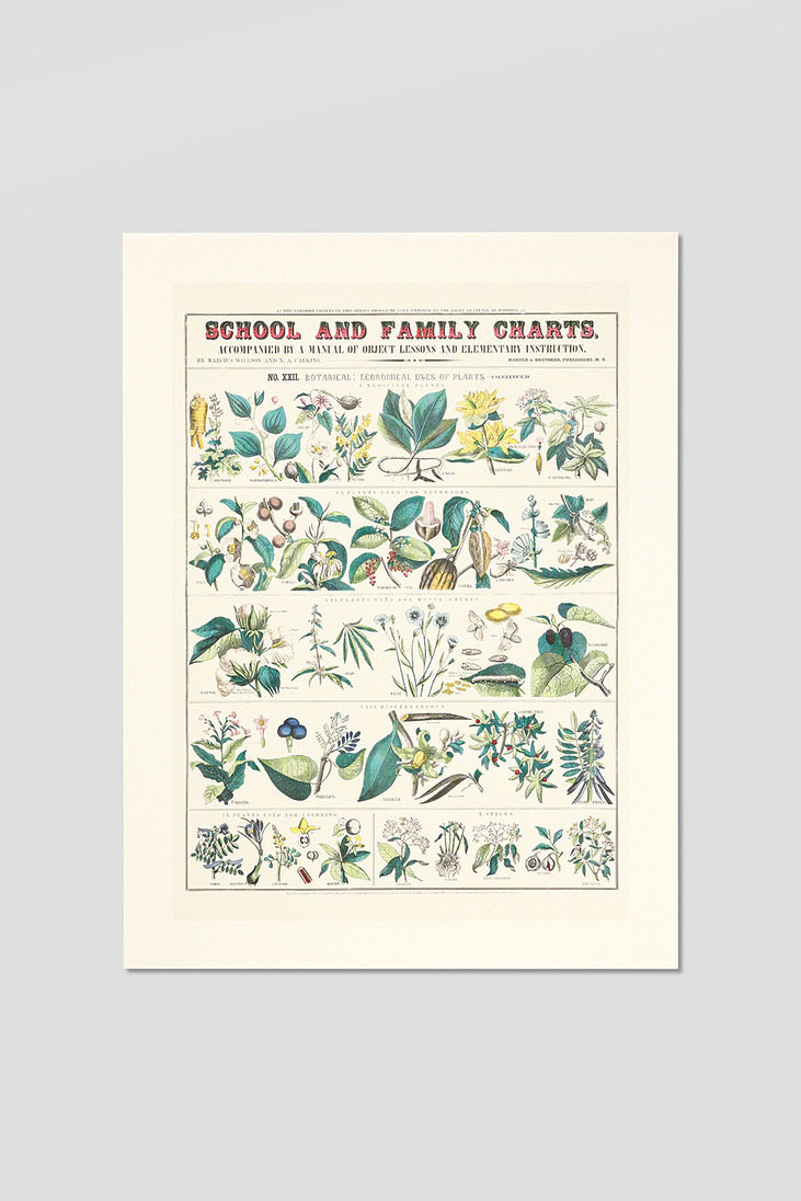 Ce tableau, consacré à l’usage domestique des plantes, est le dernier d’un ensemble de 22 planches « à exposer le moins possible à la lumière » accompagnant un Manuel de leçons de choses et d’enseignement élémentaire publié en 1890 par l’éditeur new-yorkais Harper & Brothers. Il peut nous surprendre aujourd’hui par ses choix : appartiennent toutes aux « plantes médicinales » la rhubarbe, la salsepareille, le jalap, le pavot, le séné, l’ipéca, la gentiane, le quinquina et le ricin, plus ou moins toxiques. Et parmi les plantes diverses, le tabac et la vanille côtoient le cocculus – mortel à hautes doses et utilisé pour paralyser et pêcher les poissons –, le vernis du Japon – « arbre à laque » à la résine toxique –, et le badamier de l’Inde – un autre poison pour les poissons, et pour les humains.