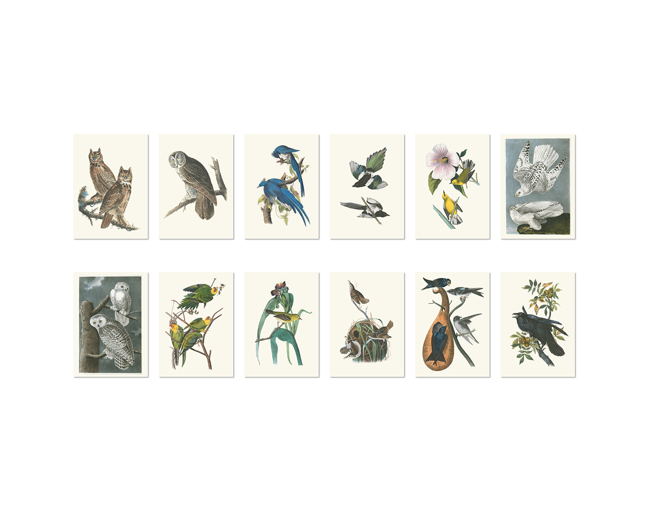 Ces 12 planches font partie des 435 gravures composant le chef-d’œuvre de Jean-Jacques Audubon (1785-1851), Les Oiseaux d’Amérique, publié par souscription en Angleterre entre 1827 et 1838. Les aquarelles du naturaliste, réalisées à partir d’oiseaux observés et chassés le long de l’Ohio et du Mississippi, sont reproduites par aquatinte et colorées à la main, ce qui ajoute à leur valeur scientifique de grandes qualités esthétiques. Les oiseaux y sont présentés grandeur nature, dans un format d’environ 98 × 66 cm : le premier ornithologue du Nouveau Monde est aussi l’auteur du plus grand livre illustré ancien du monde. L’ouvrage lui vaudra de devenir membre de la Royal Society de Londres.