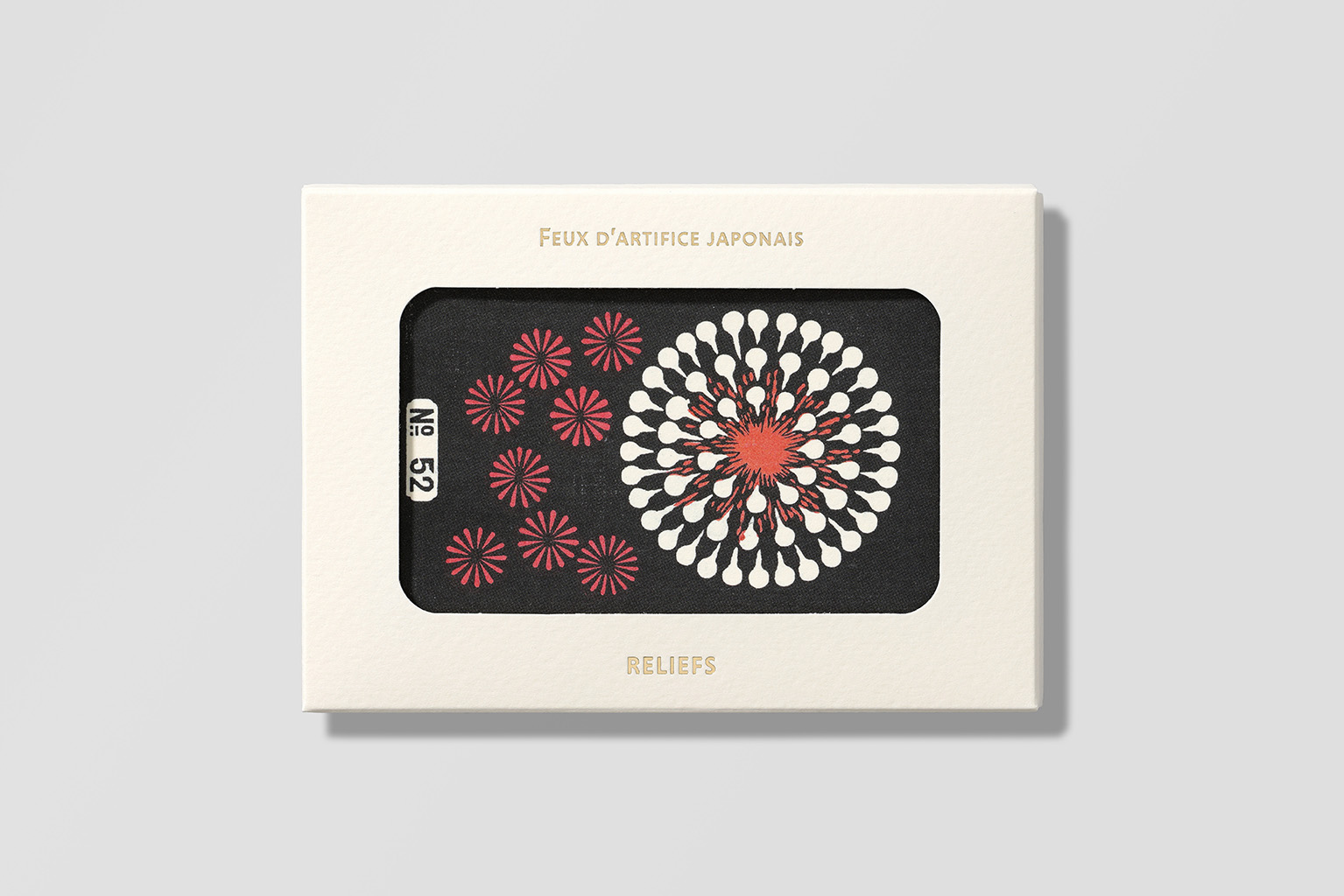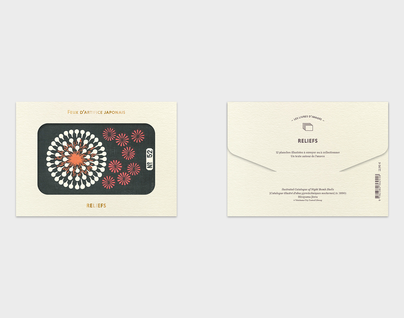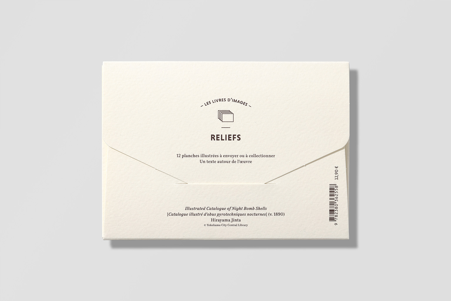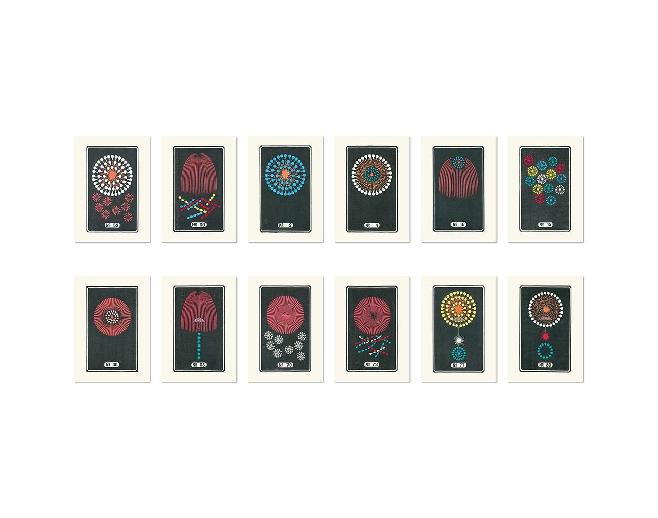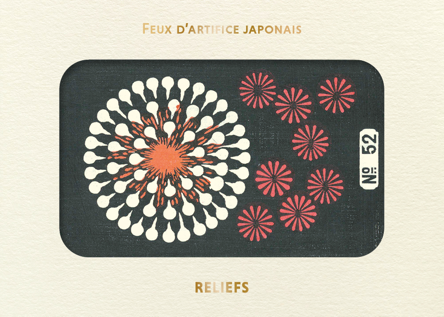 Ces 12 images sont tirées d’un catalogue publicitaire pour les feux d’artifice Hirayama, publié vers 1890 par C. T. Brock & Co, la plus ancienne manufacture pyrotechnique britannique, fondée en 1698. Les feux d’artifice, inventés en Chine autour du IIe siècle av. n. è. et apparus au Japon vers 1600 sous le nom de hanabi (« fleurs de feu »), se sont développés et épanouis au XIXe siècle à Edo (devenue Tōkyō en 1868). Hirayama Jinta ajoute aux feux d’artifice habituels – en cascades orangées – toute une gamme de motifs originaux et de couleurs brillantes. Ces illustrations simplifiées leur ajoutent une étonnante dimension graphique.