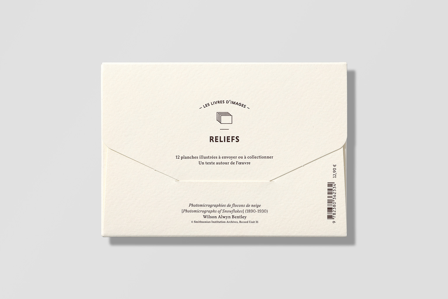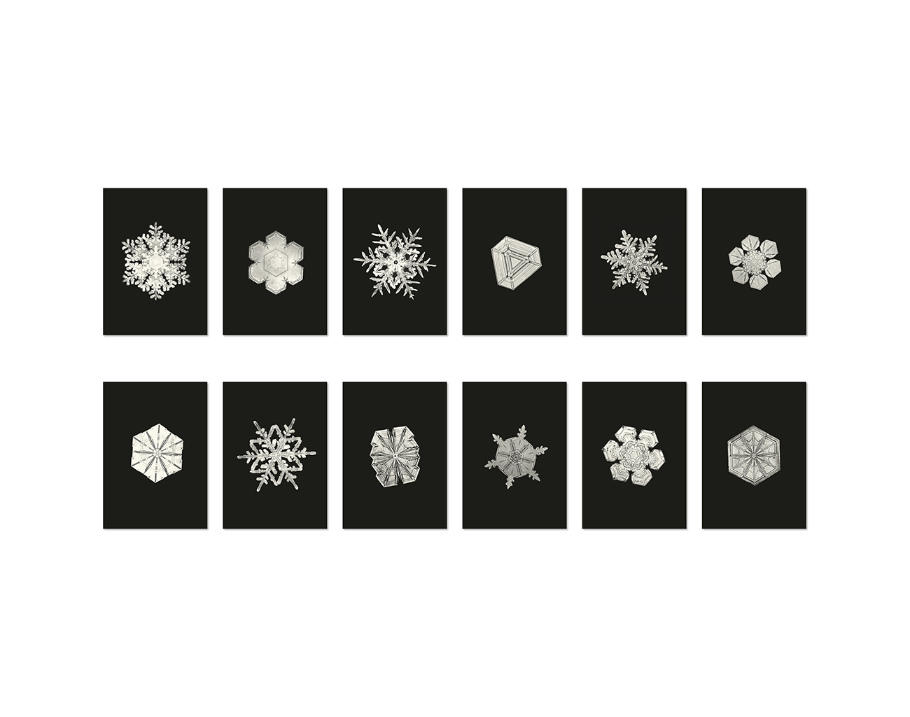Ces 12 photographies font partie des plus de 5 000 réalisées par l’Américain Wilson Alwyn Bentley. En 1885, à 20 ans, celui-ci réalise la première photo au monde d’un flocon de neige. Associant un appareil photo et un microscope, il observait un protocole immuable, impliquant par exemple une éclisse de balai, une plume de dinde, ou une mise au point par un système de cordes et de poulies. Célébré par les magazines, les joailliers et les fabricants de textiles de son temps, également pionnier de la photographie des gouttes de pluie, Bentley a écrit : “Chaque cristal de neige est un chef-d’œuvre et aucun motif ne se répète. Quand un flocon fond, le motif est perdu à jamais.”