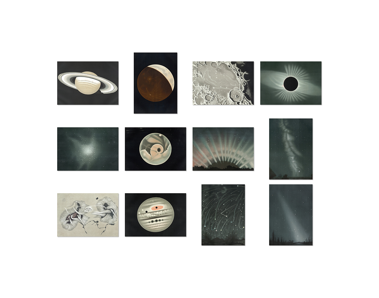Ces 12 reproductions de pastels sont tirées des Astronomical Drawings d’Étienne Léopold Trouvelot (1827-1895), publiés à New York en 1881. Ils ont été réalisés suite aux observations qu’a réalisées le peintre et scientifique entre 1872 et 1881 à l’observatoire de l’université Harvard, à Cambridge, et à l’observatoire naval des États-Unis, à Washington. Ils représentent différents objets du système solaire ainsi que des phénomènes météoriques et lumineux.