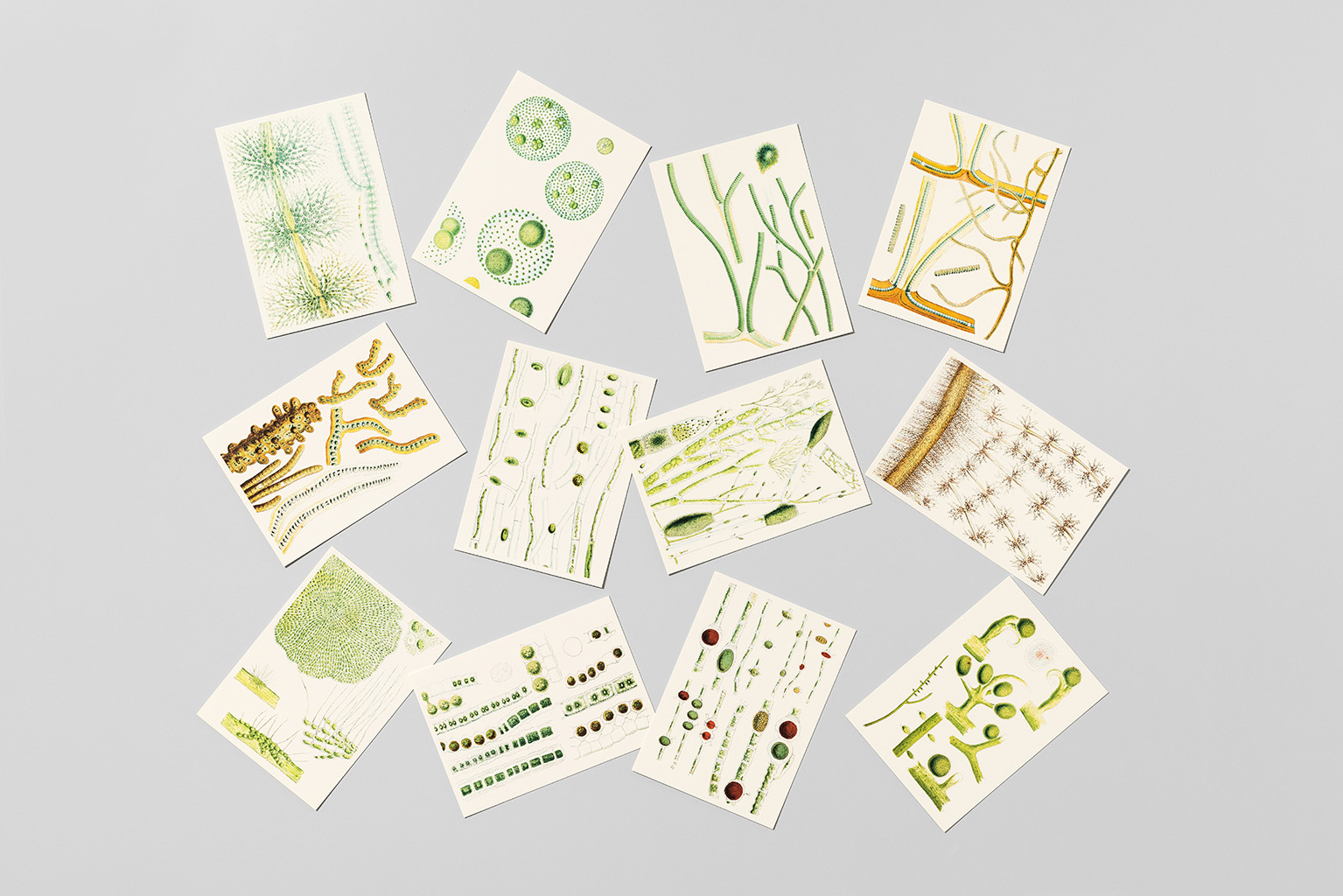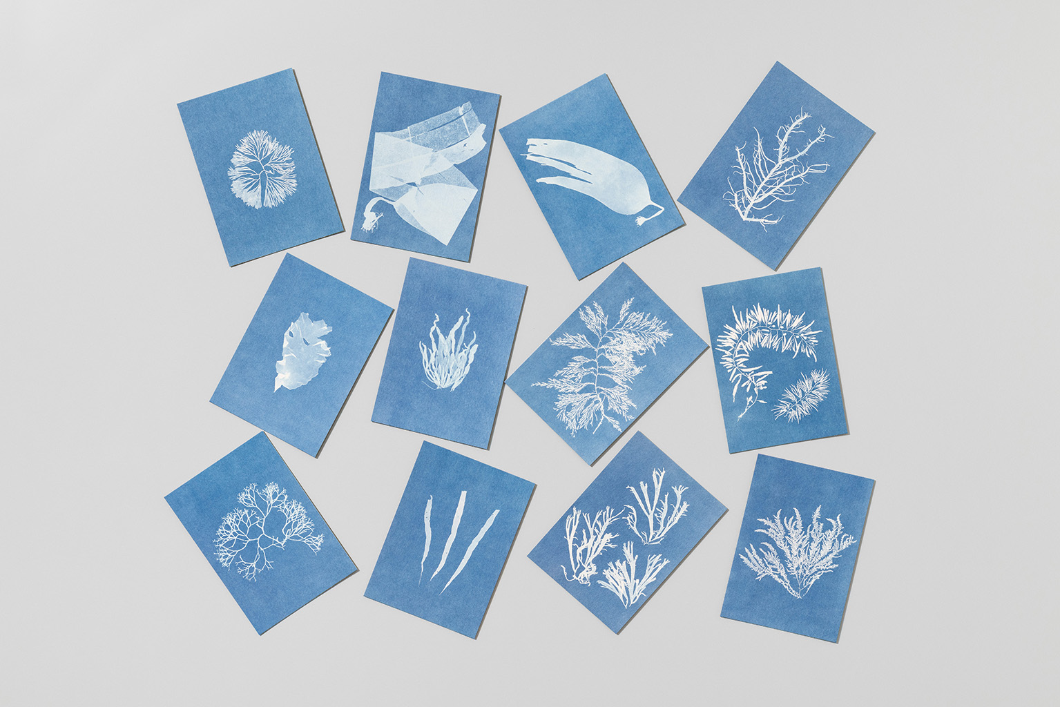 Ces douze images reprennent des cyanotypes qu’Anna Atkins (1799-1871) a publié sous le titre Photographs of British Algae [Photographies d’algues britanniques] entre 1843 et 1853. Émulsion photosensible stable à base de sels de fer et de cyanure, le cyanotype a été inventé par l’astronome et physicien John Herschel (1792-1871), qui le fait découvrir à Atkins en 1842. Dès l’année suivante, elle applique ce procédé aux macroalgues séchées de ses collections, qu’elle pose directement sur des papiers ainsi traités. Ses délicates impressions rempliront pas moins de trois volumes étalés sur une décennie. Atkins réitérera l’exercice avec Cyanotypes of British and Foreign Ferns [Cyanotypes de fougères britanniques et étrangères], Cyanotypes of British and Foreign Flowering Plants and Ferns [Cyanotypes de plantes à fleurs et fougères britanniques et étrangères].