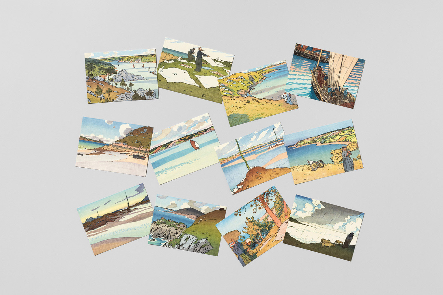 Ces « Paysages bretons » (une cinquantaine en tout) ont été gravés entre 1890 et 1914 par Henri Rivière (1864-1951). « Baie de la Fresnaye », « Bois de pins à Kermarie », « Départ des sardiniers à Tréboul », « Enterrement à Trestraou », « Gabarres devant l’île à Bois », « L’heure du pain à la Ville-Hue », « Le Pardon de Sainte-Anne–la-Palud »… ces lithographies choisissent de montrer la Bretagne, alors en processus de modernisation agricole, économique et culturelle, sous ses aspects les plus traditionnels et pittoresques. Elles rendent aussi hommage manifeste, par le choix des cadrages, la justesse de l’observation, la douceur des couleurs, l’efficace simplicité du dessin et même la présence de cartouches, à l’art japonais très en vogue de l’ukiyo-e (« images du monde flottant »).