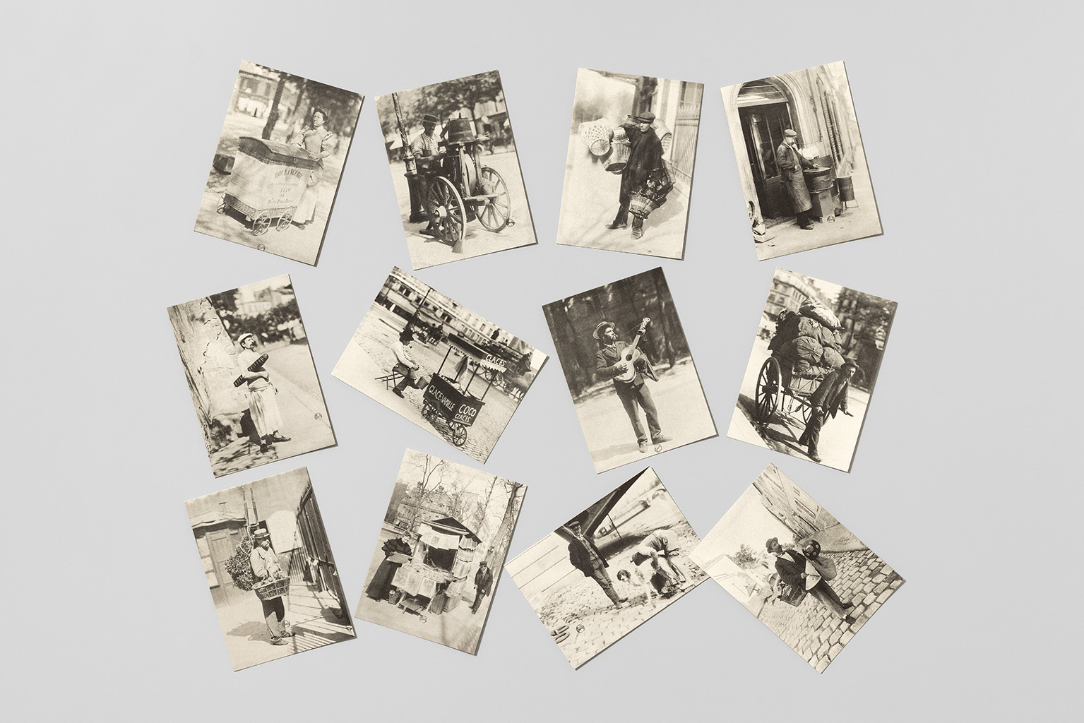 Découvrez 12 photographies tirées de la série « Petits Métiers de Paris », d’Eugène Atget ! Avant d’ouvrir un magasin de photographie en 1890 à Paris, ce Bordelais (1857-1927) a été garçon de cabine sur les lignes d’Amérique du Sud, comédien ambulant exclu du Conservatoire et peintre sans avenir. Fournisseur de « documents préparatoires » – paysages, végétaux et objets variés pour peintres (dont Braque et Utrillo), bâtiments et monuments pour architectes –, il se lance à partir de 1897 dans une des séries documentaires qui ont fait sa gloire : « Paris Pittoresque », 900 photographies qui ignorent ostensiblement les quartiers hausmanniens. Elles incluent cette sous-série centrée sur de petits artisans et marchands dont les métiers sont déjà presque obsolètes (marchande de mouron ou de crème, marchand de papier à lettres ou de mèches pour fouet…). Soigneusement posées, ces images verticales stéréotypées à la manière des cartes postales, mais qui s’en démarquent par l’usage remarquable des arrière-plans, composent un reportage empathique et précis sur les activités de la rue et les personnages qui les incarnent.