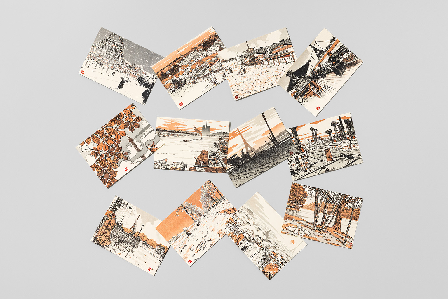 Ces 12 images sont issues de la série Les trente-six vues de la Tour Eiffel. Développée sous forme de gravures sur bois au moment de la construction de la tour Eiffel (1887-1889), finalement exécutée en lithographie en utilisant pas moins de cinq matrices, cette série d’estampes en douze couleurs tirée à 500 exemplaires sur papier vélin est achevée en 1902, soixante-dix ans exactement après son modèle révéré, les Trente-six vues du mont Fuji de Katsushika Hokusai (1760-1849). Henri Rivière (1865-1951), peintre, graveur, illustrateur et ancien directeur artistique du théâtre d’ombres du Chat noir, célèbre cabaret de Montmartre, y déploie sa passion japonisante et sa maestria technique en multipliant cadrages, angles de vue et atmosphères. La réalisation de cet élégant in-quarto oblong (235 × 290 mm) est l’œuvre conjointe de son éditeur favori, l’imprimeur Eugène Verneau (1853-1913), du graphiste et poète George Auriol (1863-1938) et du critique d’art et fondateur du Rire Arsène Alexandre (1859-1937), qui dans son prologue qualifie drôlement la tour Eiffel de « grande baguette à suspendre les kakémonos ».