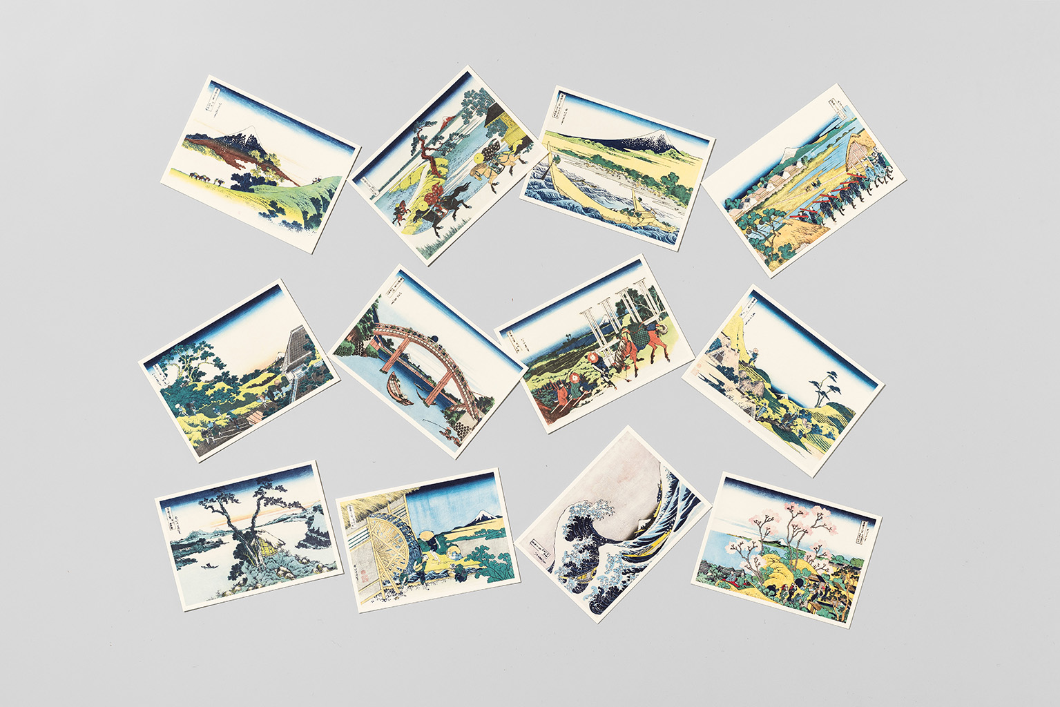 Les Trente-six Vues du mont Fuji, réalisées par Katsushika Hokusai entre 1831 et 1834, comportent 36 estampes, plus dix planches supplémentaires, au format ōban de 24 × 37 cm. Leur maîtrise du bleu de Prusse, introduit au Japon en 1829, est si spectaculaire que l’éditeur Nishimuraya Yohachi décide de les publier d’abord en aizuri-e (« images imprimées en bleu »). Le Fuji est leur sujet unique, totem naturel national et axe permanent, proche ou lointain, autour duquel s’organisent paysages, éléments, saisons, vivant et humains. Les compositions jouent avec un art subtil des traditions du paysage japonais et des principes de la perspective occidentale. Et la variété des thèmes s’allie avec la minutie des traits, qui privilégient souvent les contrastes entre les plans.