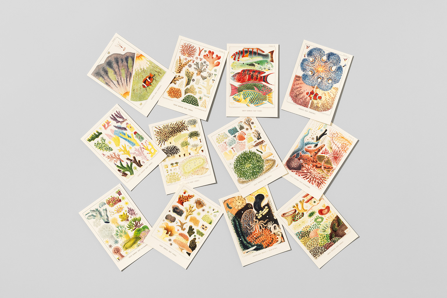 Ces douze planches proviennent d’un ouvrage publié en 1893 par William Saville-Kent (1845-1908), The Great Barrier Reef of Australia [La Grande Barrière de corail d’Australie] décrit les coraux, polypes et autres êtres vivant dans la barrière de corail au large de la côte du Queensland. Illustré par une cinquantaine de photographies minutieusement légendées, l’ouvrage prend une dimension particulièrement esthétique dans ses dernières pages, qui offrent seize lithographies en couleurs réalisées à partir des aquarelles originales de Saville-Kent. La précision scientifique est quelque peu sacrifiée, mais l’éclat spectaculaire des couleurs rend justice aux nuances infinies de la vie proliférant alors dans la Grande Barrière de corail, menacée aujourd’hui par le réchauffement climatique.