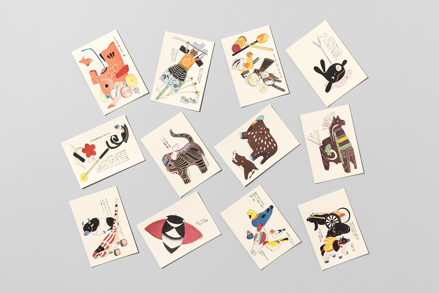 Ces 12 images sont issues de Unai no tomo (« Les amis des enfants »), catalogue de jouets traditionnels japonais en dix volumes réalisé par Shimizu Seifū (1851-1913) et publié entre 1891 et 1923. Il rassemble des centaines de gravures sur bois de jouets (omocha) et poupées (ningyō) dérivés d’amulettes et de talismans inscrits dans la tradition du shintō et du folklore nippon. Poulet-diable en boîte, baleine à roulettes, souris magnétique, lutteur sumo en argile, pistolets à bouchon, chevaux-bâtons, jouets sonores : tous ces objets sont considérés par les collectionneurs et les historiens comme un témoignage inestimable de l’histoire, de la culture, de la religion et de la vie familiale au Japon.