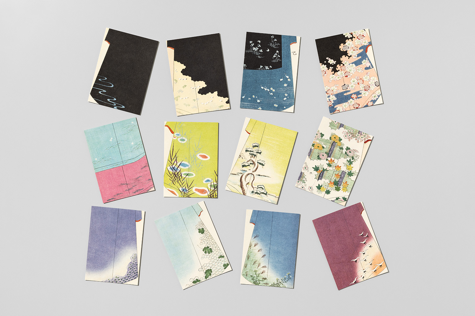 Ces 12 images de motifs gravés sur bois sont tirées de trois catalogues publiés par la maison d’édition Honda Hunkindō de Kyōto. Ils mêlent les thèmes de l’ukiyo-e (« images du monde flottant »), l’abstraction, les traits géométriques et les scènes de nature. Le kimono se transforme sous l’ère Meiji (1868-1912) : il est opposé aux habits occidentaux, symboles de modernité, et représente une continuité culturelle largement mythifiée, influencée par les nouvelles techniques de production textile et de teinture venues de l’ouest. L’édition obéit au même principe : reliés dans le style classique fukurotoji (doubles pages cousues), les livres d’échantillons présentent des modèles réalisables selon la technique récente du kata-yūzen.