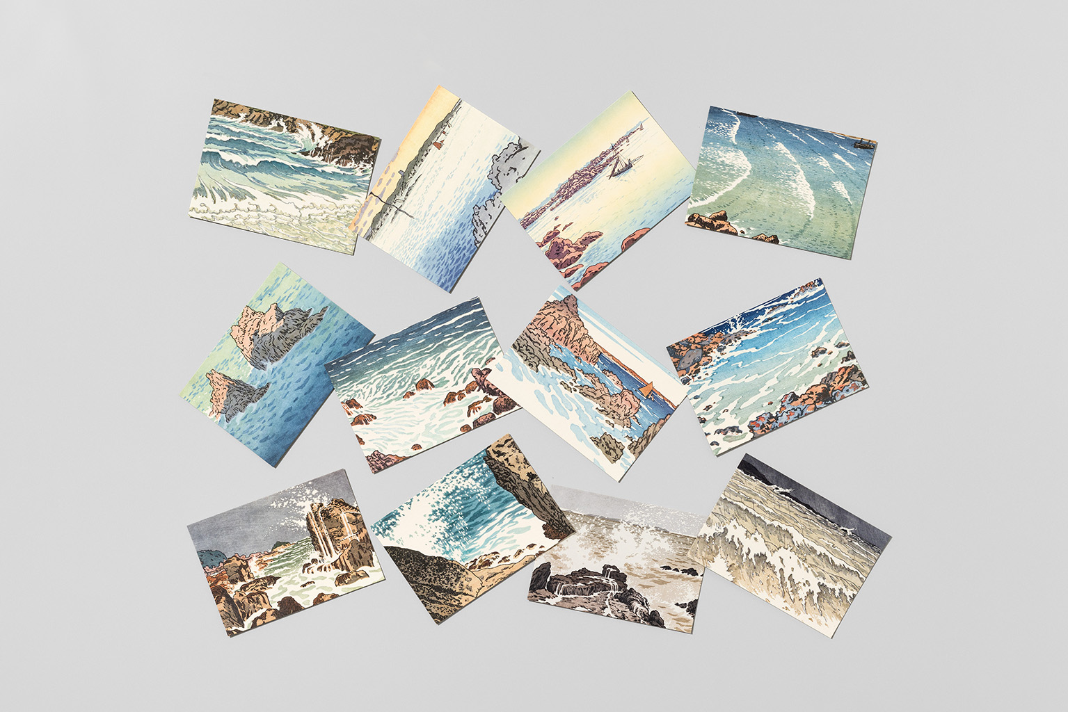Ces douze images proviennent de deux séries d’estampes maritimes d’Henri Rivière. En 1890, Henri Rivière se rend à Saint-Briac, et peint des aquarelles qui donneront naissance à sept planches regroupées sous le titre « La Mer : études de vagues ». Elles ont été gravées sur bois et en couleurs à la même époque que la cinquantaine de « Paysages bretons » – dont certains sont représentés ici – par le peintre. Par le choix des cadrages, la justesse de l’observation, la douceur des couleurs, l’efficace simplicité du dessin et la présence de cartouches, il rend un hommage manifeste à l’art traditionnel japonais de l’ukiyo-e (« images du monde flottant »).