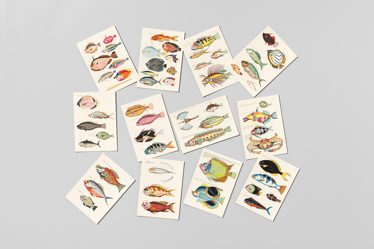 Ces douze planches reprennent quelques-uns des 415 poissons et 45 crustacés, plus un dugong et une sirène, illustrant les deux volumes de Poissons, écrevisses et crabes, de diverses couleurs et figures extraordinaires, que l’on trouve autour des isles Moluques et sur les côtes des terres Australes (1718-1719), réalisés par Louis Renard (v. 1678-1746). « Peints d’après nature sous la régence de Messieurs van Oudshoorn, van Hoorn, van Ribeek & van Zwoll, successivement Gouverneurs-Généraux des Indes Orientales pour la Compagnie de Hollande », ils constituent la première encyclopédie ichtyologique illustrée en couleurs. La majorité des gravures sur cuivre colorisées à la main, correspondent à une faune réelle, mais un certain nombre relèvent de la plus haute fantaisie de motifs et de couleurs, pour le plus grand plaisir des yeux d’hier et d’aujourd’hui.