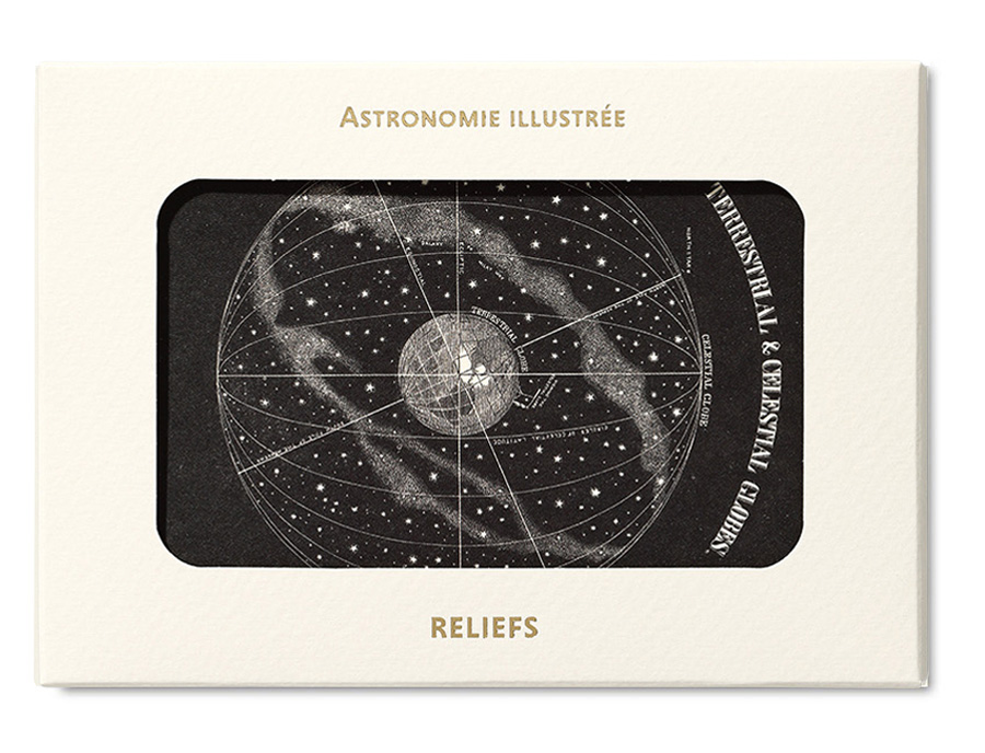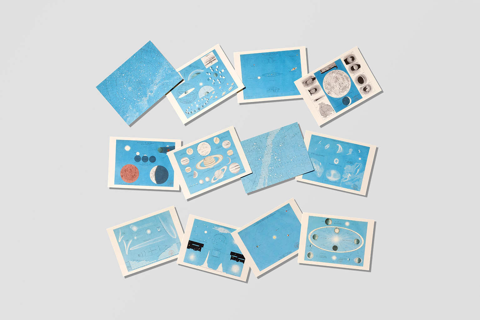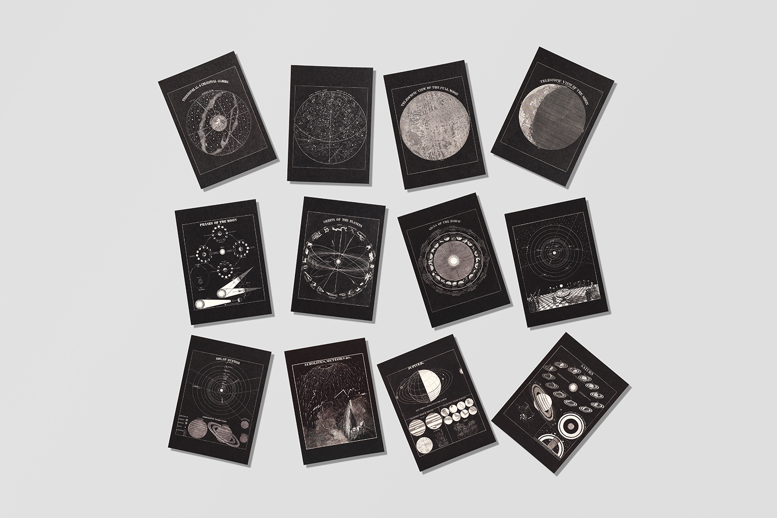 Ces 12 images au fond bleuté font partie des 21 planches de l’Atlas astronomique du géographe écossais Alexander Keith Johnston (1804-1871), présentant, entre autres, les mouvements et phases de la lune et du soleil, les éclipses, le système solaire et différents objets astronomiques (constellations, nébuleuses, comètes et météores). L’auteur des textes est un autre Écossais, Robert Grant (1814-1892), directeur de l’observatoire de Glasgow et fin analyste du soleil, dont il a étudié la chromosphère et les éruptions.