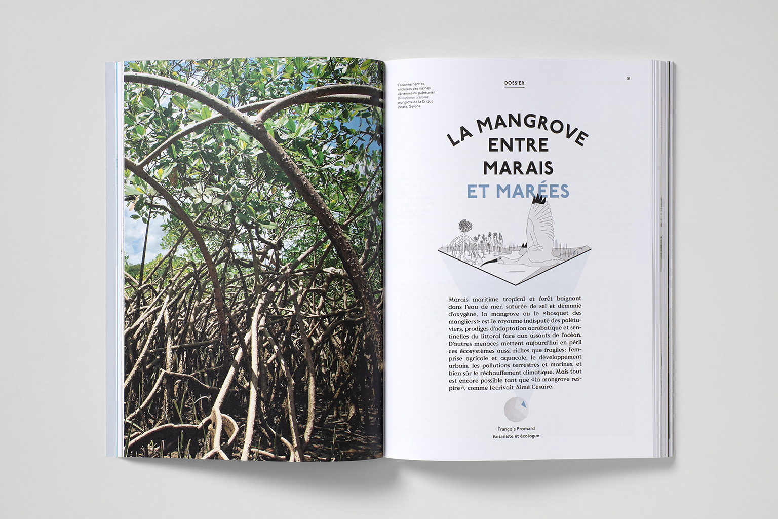 Marais maritime tropical et forêt baignant dans l’eau de mer, saturée de sel et démunie d’oxygène, la mangrove ou le « bosquet des mangliers » est le royaume indisputé des palétuviers, prodiges d’adaptation acrobatique et sentinelles du littoral face aux assauts de l’océan. D’autres menaces mettent aujourd’hui en péril ces écosystèmes aussi riches que fragiles : l’emprise agricole et aquacole, le développement urbain, les pollutions terrestres et marines, et bien sûr le réchauffement climatique. Mais tout est encore possible tant que « la mangrove respire », comme l’écrivait Aimé Césaire.
