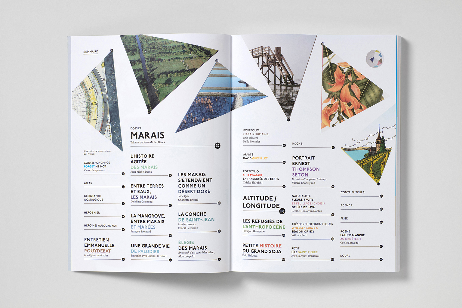 Hors dossier : atlas, cartes géographiques anciennes, héros et héroïnes d’hier et aujourd’hui, un entretien avec Emmanuelle Pouydebat, des portfolios de Nelly Monnier, d’Eric Tabuchi et de Chieko Shiraishi, un aparté avec David Grémillet, les migrations climatiques de l’Anthropocène par François Gemenne, l’histoire du soja par Éric Birlouez, un portrait d’Ernest Thompson Seton par Valérie Chansigaud, planches naturalistes, trésors photographiques, récit et poème illustrés, agenda culturel…