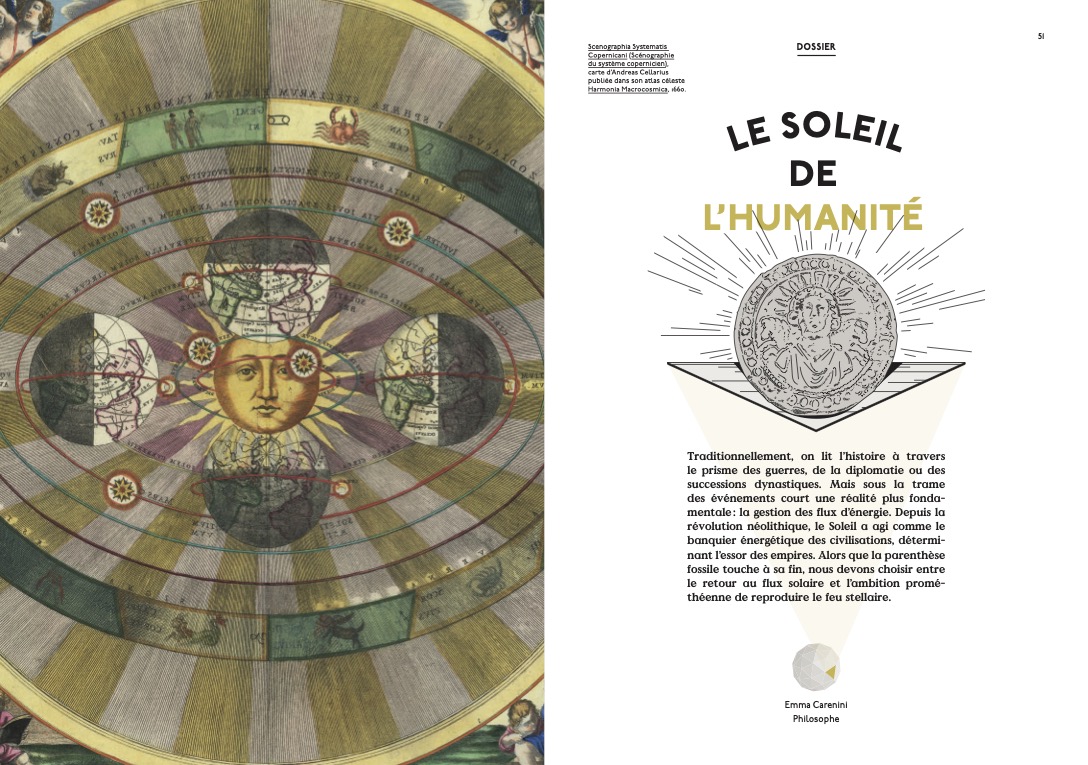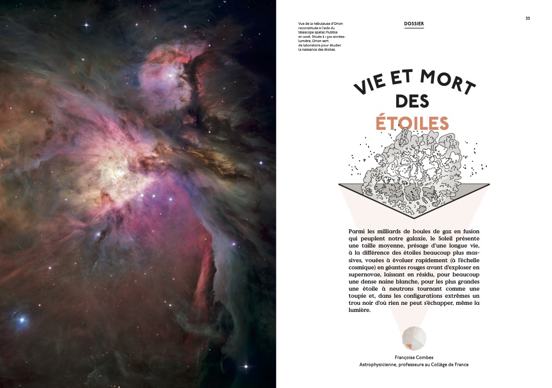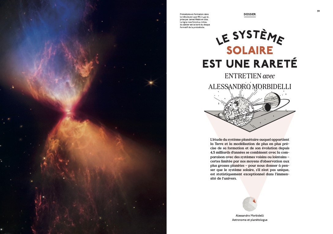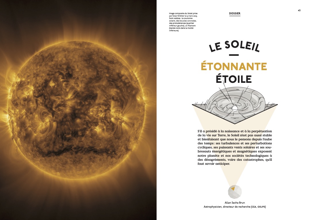 Dossier Soleils : “Vie et mort des étoiles” par Françoise Combes, “Le Soleil, notre étoile” par Allan Sacha Brun, “Sous le Soleil” par Emma Carenini, un entretien avec Alessandro Morbidelli sur la formation et l’évolution du système solaire, extraits littéraires illustrés, infographies, conseils de lectures, de films, de musiques…