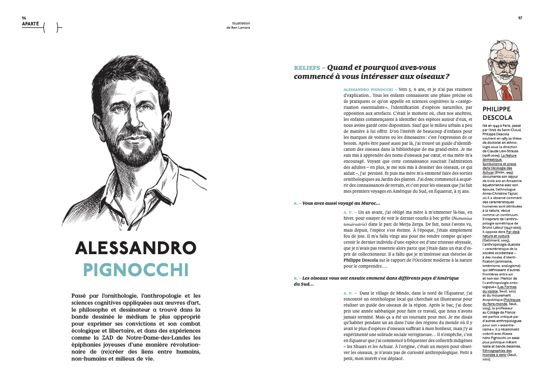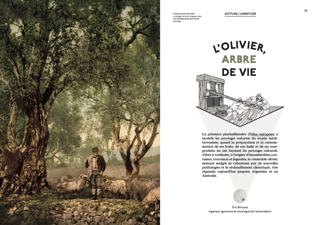 Hors dossier : correspondance, atlas, cartes géographiques anciennes, héros et héroïnes d’hier et aujourd’hui, un entretien avec Anne Charmantier sur la mésange bleue, un aparté avec Alessandro Pignocchi, une petite histoire de l’olive par Éric Birlouez, un portrait d’Anna Botsford Comstock par Valérie Chansigaud, trésors photographiques, récit et poème illustrés, agenda culturel…